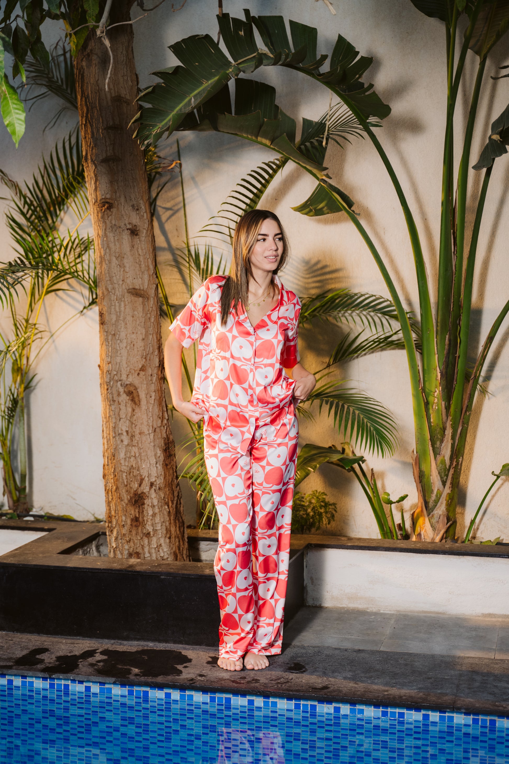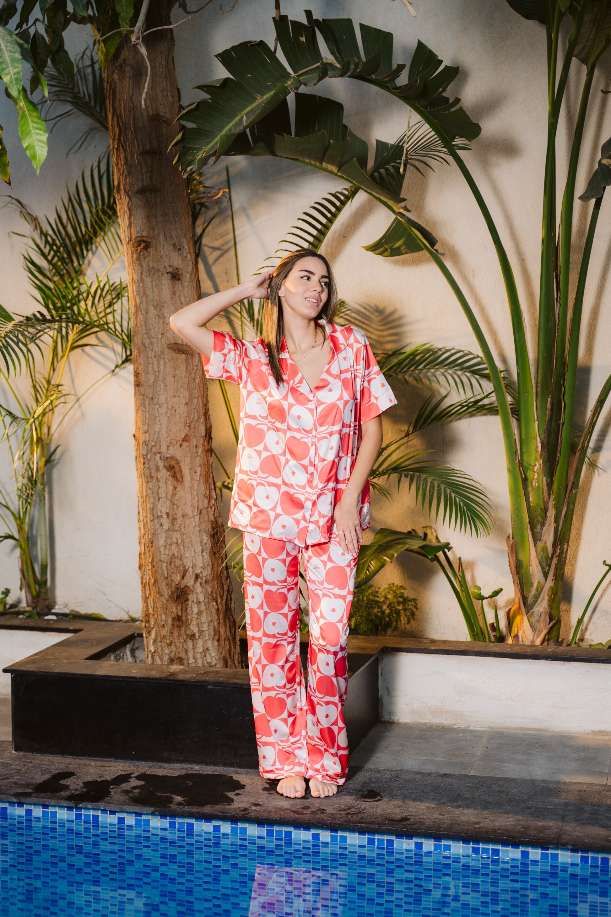 Indulge in luxurious comfort with our delightful Satin pajama set featuring charming coral apple prints on crisp white. This playful design brings orchard sweetness to your sleepwear collection.