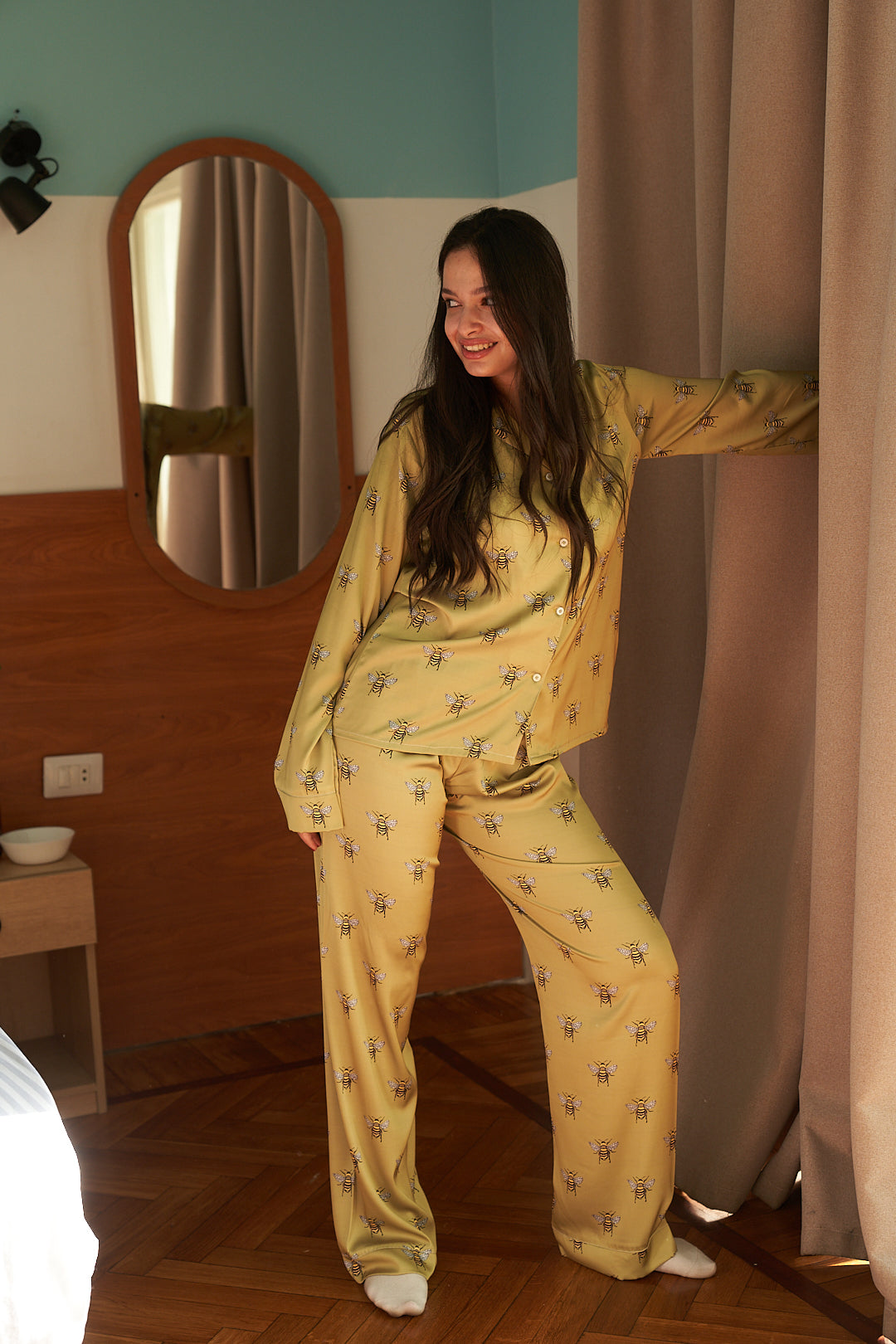 Bee Printed PJ – crafted from silky satin, this pajama features delicate bee prints dancing over soft pastel shades . Its luxurious touch and playful charm create the perfect balance between elegance and coziness — made for nights that feel as sweet as honey. 🍯
