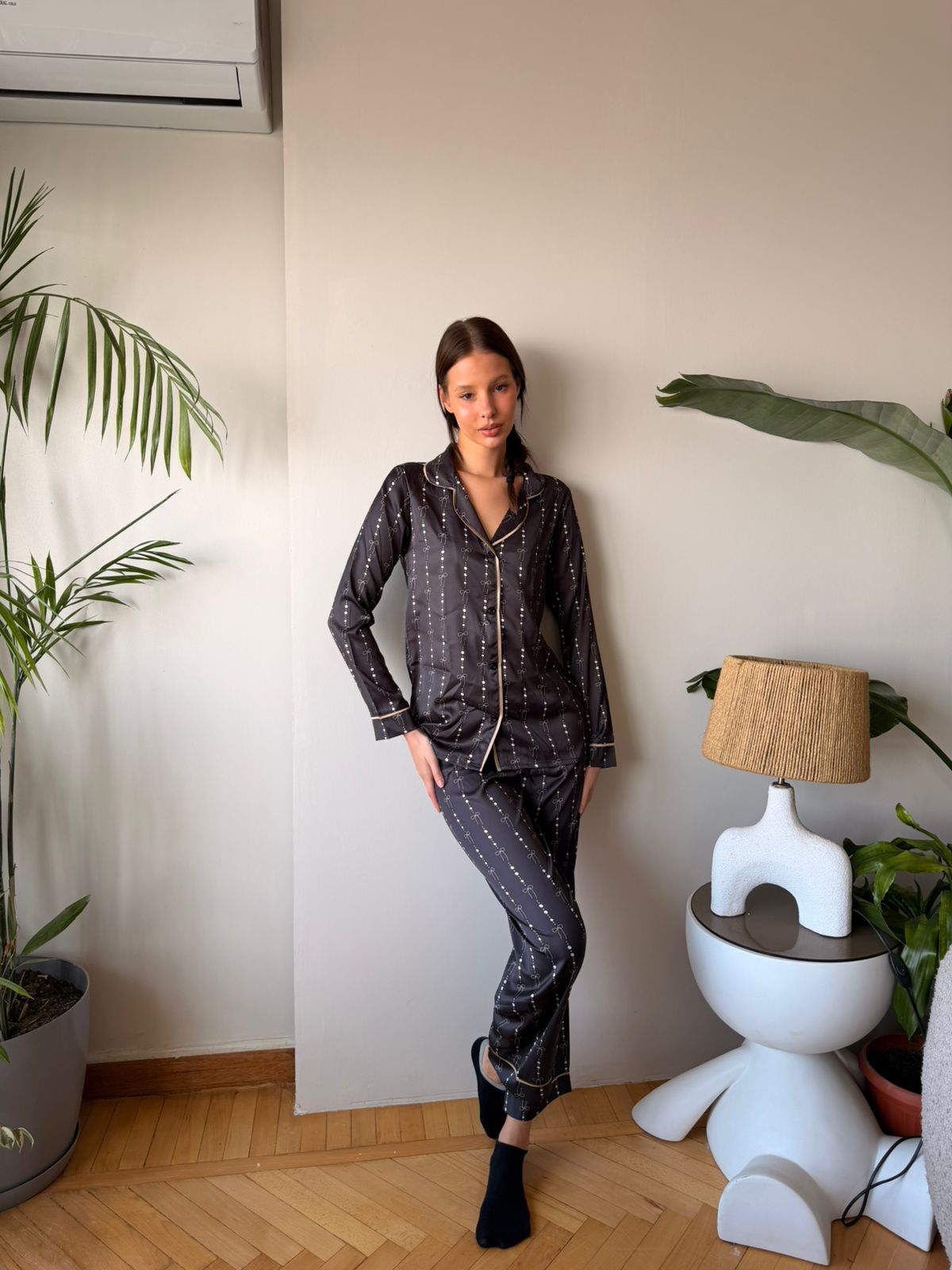 A sleek black satin pajama set designed with delicate bow details for a soft, feminine touch.