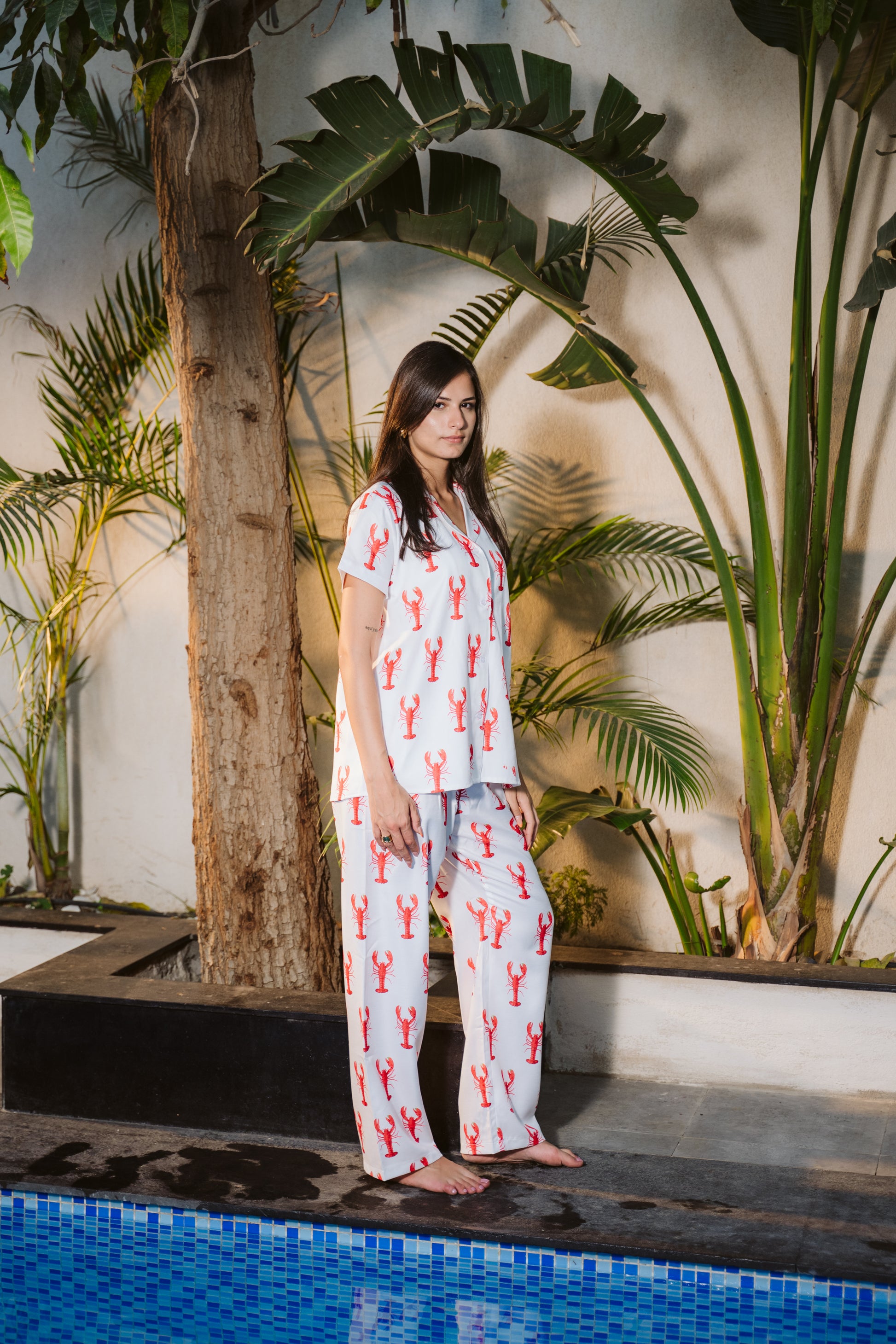 Fall in love with our charming linen pajama set featuring adorable coral lobster prints on crisp white. This whimsical design brings coastal charm to your bedtime routine with the breathability of pure linen.