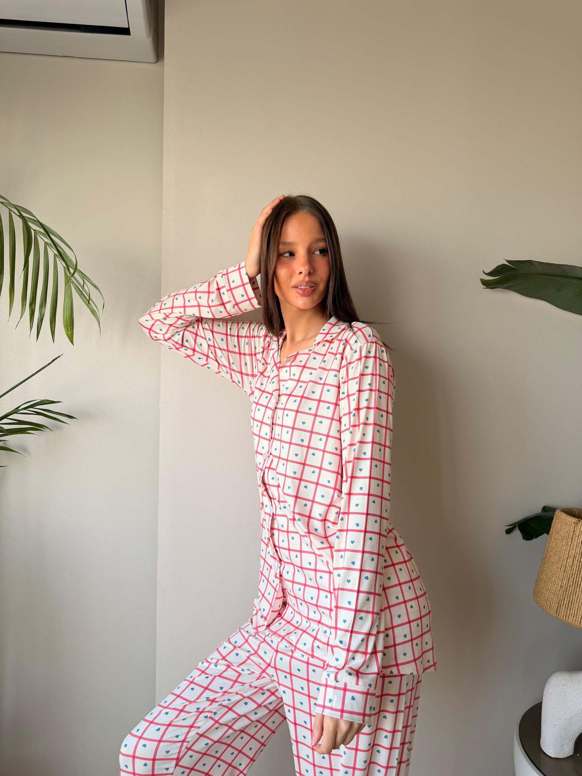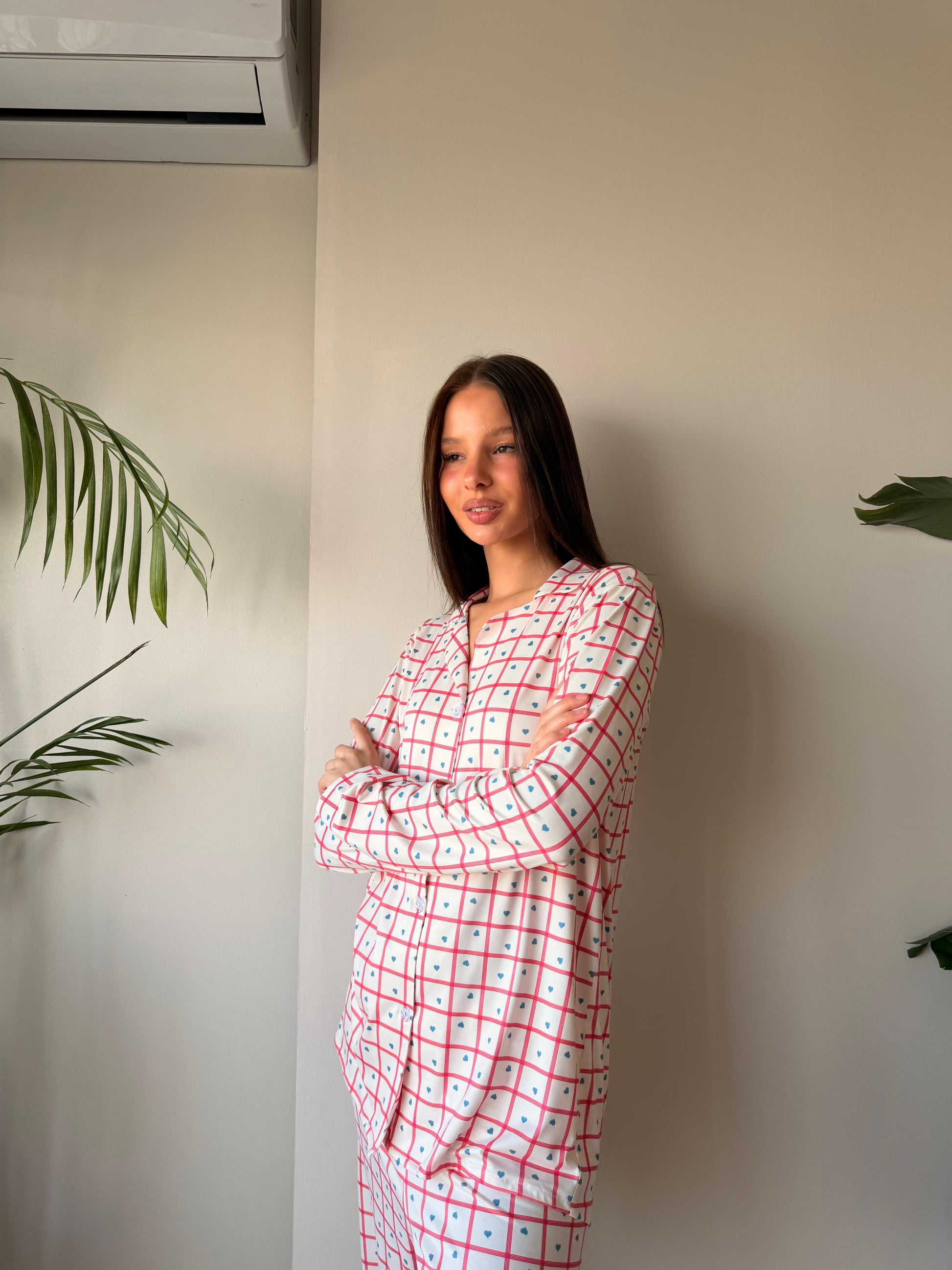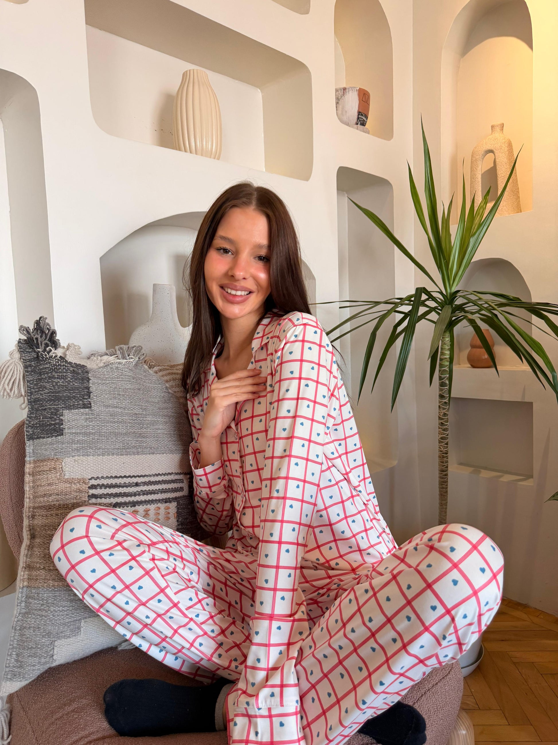 A soft cotton pajama set designed for breathable, all-day comfort. Featuring playful pink squares and a relaxed fit for a timeless, effortless look