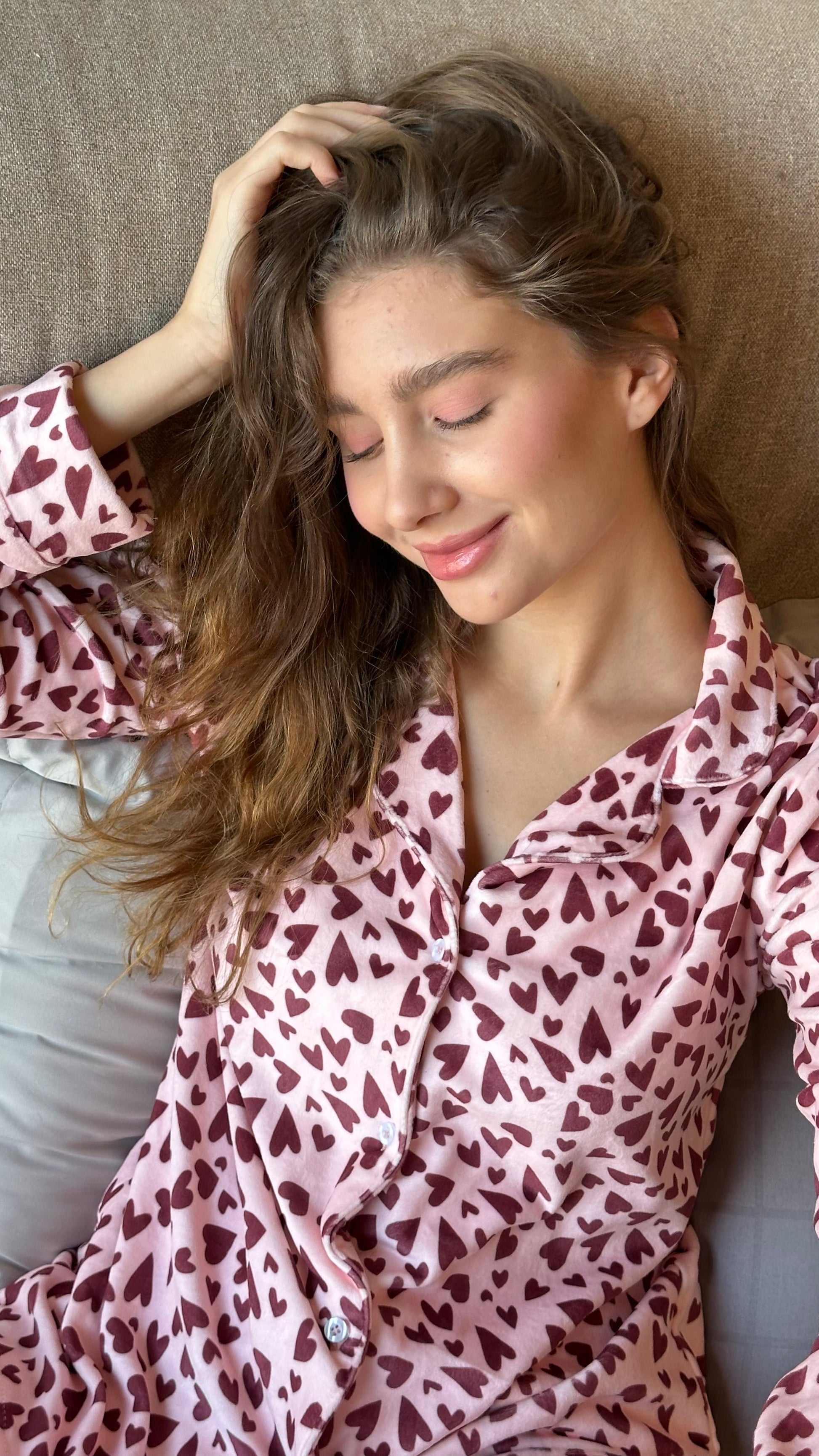 "Subtle, sweet, and incredibly soft. Adorned with delicate dark hearts on a dusty rose background, these pajamas are the definition of cozy luxury for your peaceful nights."