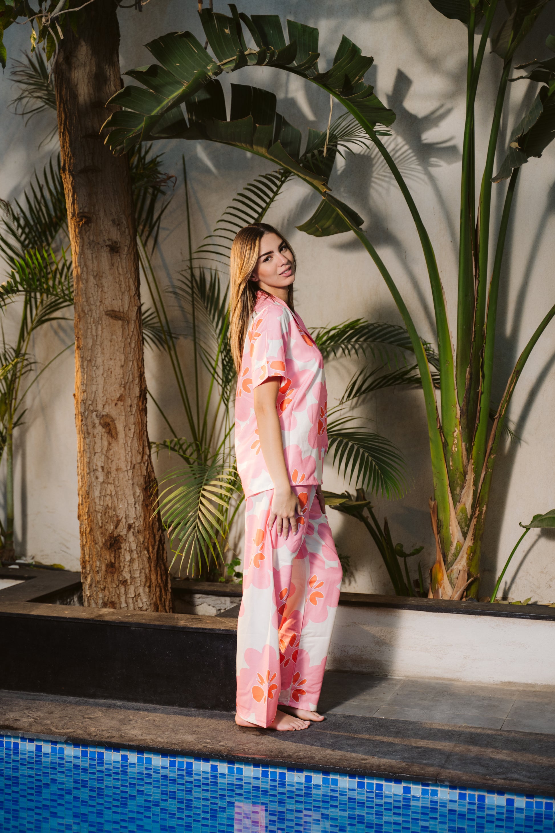 Soft, breezy, and full of charm. This linen-blend pajama set features a relaxed fit and playful floral print in pink and orange – perfect for slow mornings and dreamy nights.